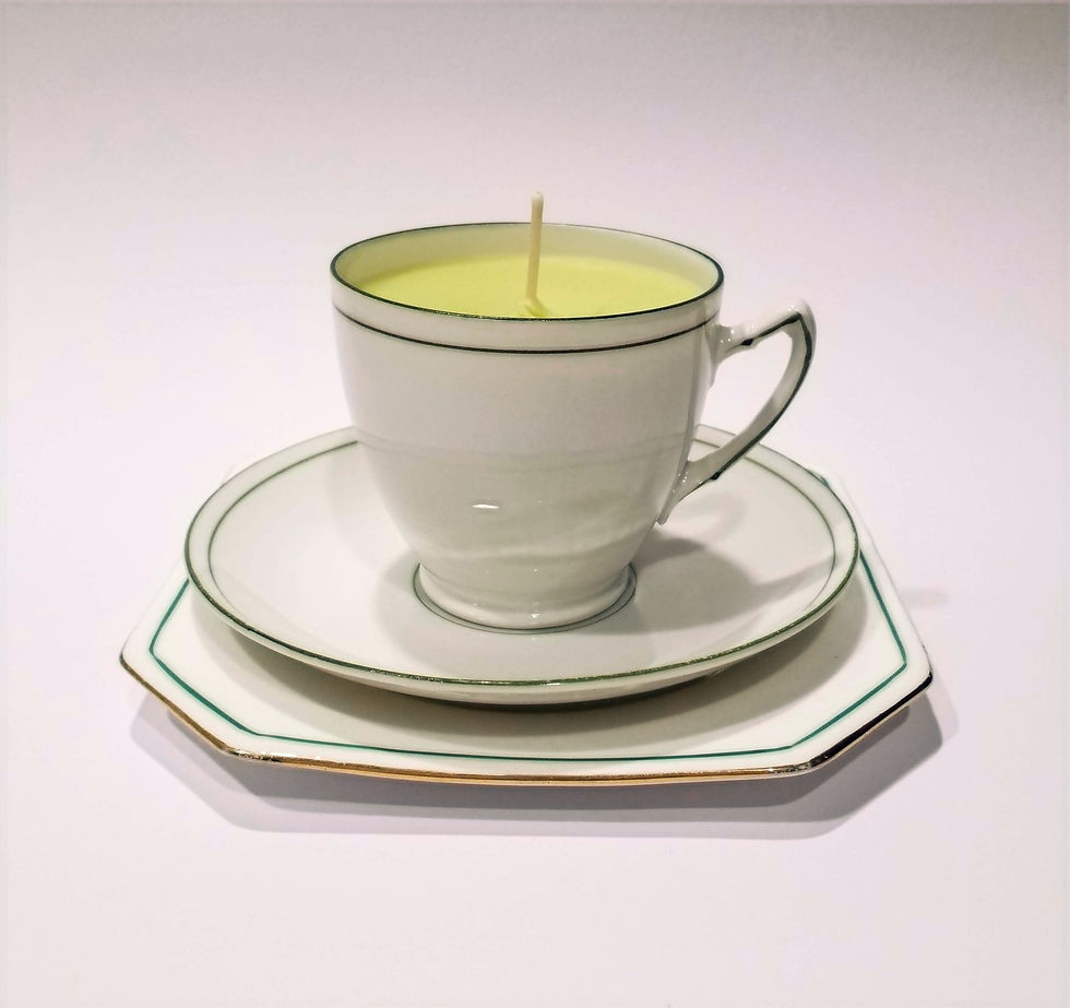 A Trio Soy Candle is a reusable three piece set. Teacup, Saucer and Plate.